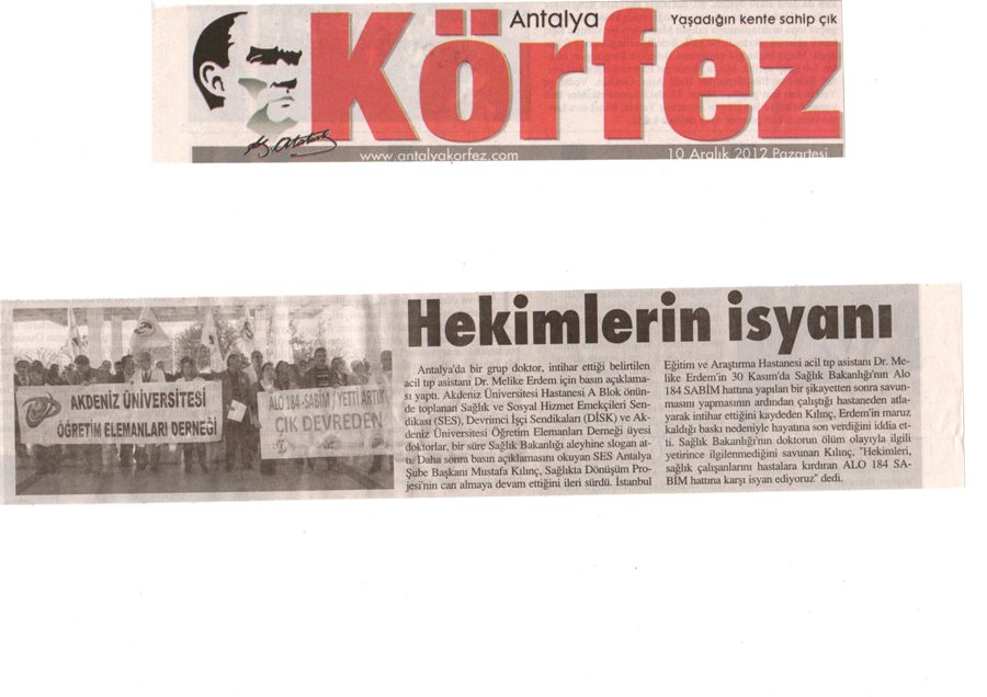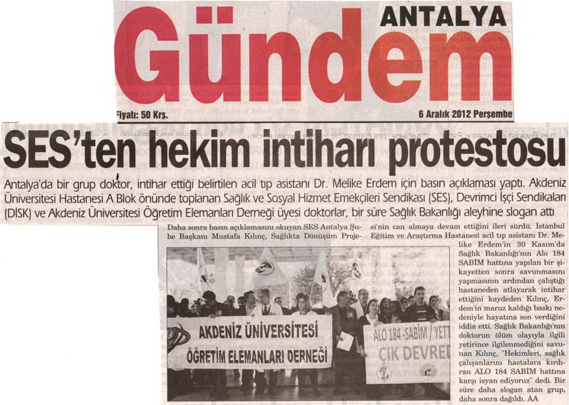 Dr.Melike Erdem’in  intiharı ile ilgili SES Antalya Şubesi, Dev-Sağlık-İş ve Akdeniz Üniversitesi