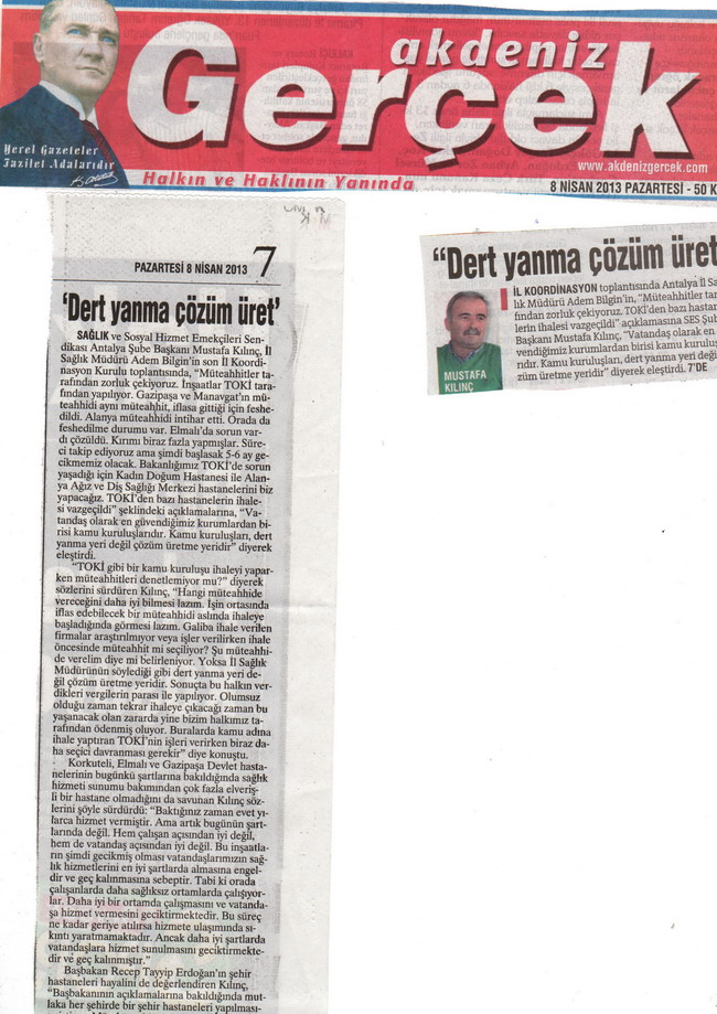 Bu açıklamalara tepki gösteren SES Antalya Şube Başkanı Mustafa Kılınç, “Merak ediyoruz madem Sağlık Bakanlığı kendisi hastane yapabiliyordu neden TOKi ile hastane yapımları için protokol yapıldı. Tamamlanamayacak hastanelerin tamamlanması için bu protokollerde Sağlık Bakanlığı lehine herhangi bir madde var mı? Nasıl oluyor da ihaleyi alan firma daha inşaat aşamasında iflas ediyor. TOKİ ihaleyi açarken şirketlerin yeterliliğini kontrol etmiyor mu? Yoksa ihaleler şartnamelere uygun firmalara değil de sadece iktidara yakınlığı olana firmalara mı veriliyor? İhaleler verildikten sonra inşaatlar yada inşaatları yapan firmalar mütahitler denetleniyor mu? Yarım kalan hastane inşaatların ücretleri yine halkımızın cebinden çıkıyor. Sağlık İl Müdürlüğü bunlardan şikayet edeceğine bu durumun hesabını TOKİ’den sormalıdır. TOKİ’ nin eline yüzüne bulaştırdığı işi neden Sağlık İl Müdürlüğü tamamlamaya çalışıyor. Sağlık İl Müdürü bu sorulara da cevap verirse seviniriz. Bizler de halkımızın daha iyi bir şekilde sağlık hizmeti alabilmesi için en iyi hastanelerin yapılmasını isteriz ama hastane yapacağız diye halkın ödediği vergilerin bu şekilde çarçur edilmesini doğru bulmuyoruz” dedi.