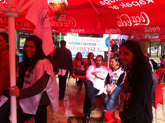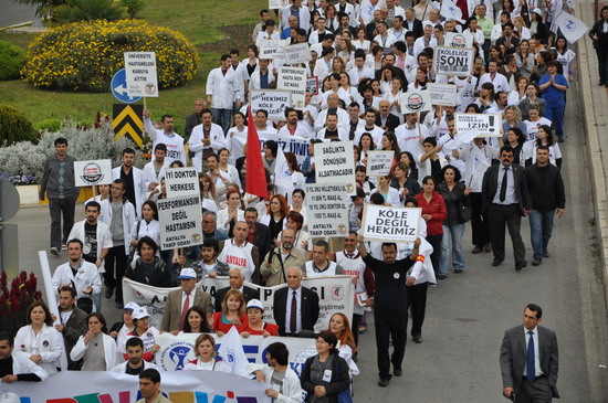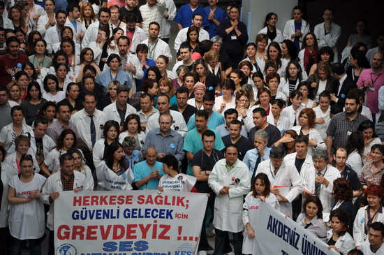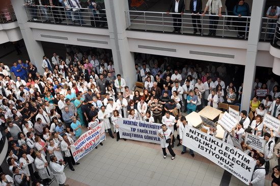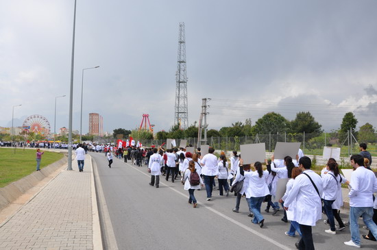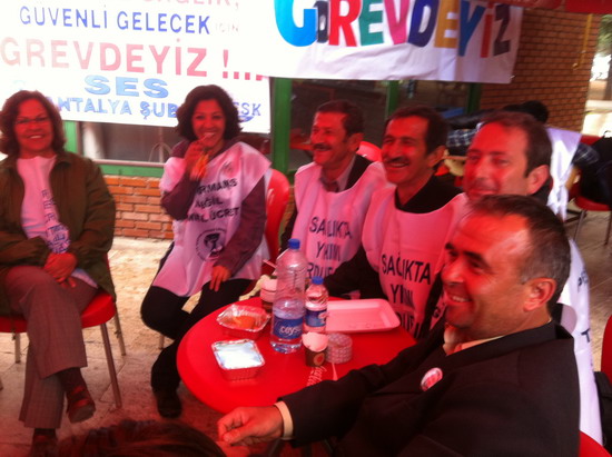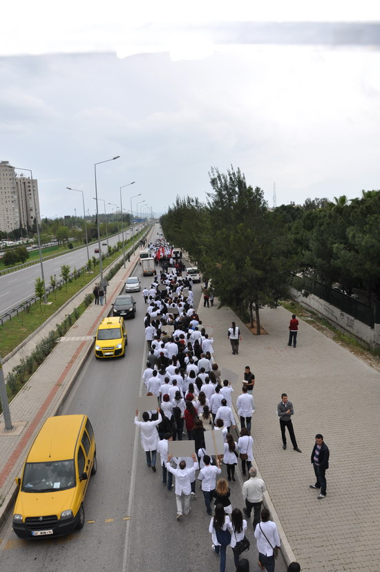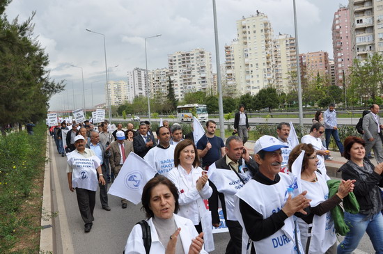 katılımlı iş bırakma eylemi gerçekleştirildi. Eğitim ve Araştırma Hastanesi ve Tıp Fakültesi Hastanesi bahçesinde toplanan sağlıkçılar iki koldan yürüyüşe geçtiler. Meltem mahallesi kavşağında bir araya gelen sağlıkçılar Sağlık Müdürlüğü’ne yürüyüşe geçtiler. Yaklaşık bin kişi sloganlarla yürürken yol boyunca vatandaşlardan alkışlarla destek aldılar. İl Sağlık Müdürlüğü önünde SES Antalya Şube Başkanı Mustafa Kılınç, Dev-Sağlık İş Şube yönetim kurulu üyesi Nasuf Ekici Akdeniz Üniversitesi Öğretim Üyesi İlker Belek birer konuşma yaptılar. Tıp Fakültesi Hastanesi bahçesinde grev çadırı kuran sağlıkçılar eylemlerine yarında devam edeceklerini açıkladılar.