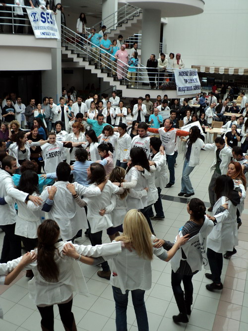 Tıp Fakültesi Hastane atriumunda toplanan sağlıkçılar halaylar ve şarkılar eşliğinde grev etkinliklerini sürdürdüler. Tıp fakültesi öğretim üyesi Doç.Dr. İlker Belek, SES Antalya Şube Başkanı Mustafa Kılınç, asistan, öğrenci temsilcileri ve yatan hasta yakınlarının konuşma yaptıkları eylem şarkılar türküler ve halaylarla sürüyor.