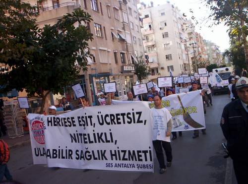 SES Antalya Şubesi tarafından organize edilen ve birçok sendika, dernek, meslek odası ve siyasi parti tarafından da desteklenen“Sağlık Haktır. Hakkımıza Sahip Çıkıyoruz. Sağlıkta Yıkımı Durduralım Mitingi” coşkulu ve katılımlı bir şekilde yapıldı.