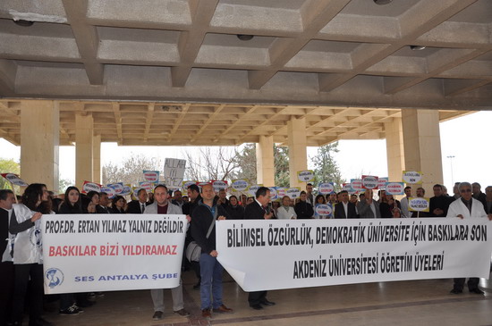“Akademik Özerklik, Bilimsel Özgürlük Demokratik Üniversite için Baskılara Son” pankartı taşıyan ve “Rektör İstifa” “Baskılar Bizi Yıldıramaz”, “Ertan Yılmaz Yalnız Değildir” sloganları atan yüzlerce kişi üniversite yönetimini istifaya çağırdı.