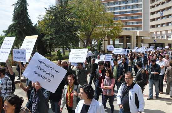 “Üniversitede Hukuksuzluğa ve Baskılara Son” pankartı taşıyarak, “Rektör İstifa” “Baskılar Bizi Yıldıramaz”, “İlker Belek Yalnız Değildir” “Üniversiteler Bizimle Özgürleşecek” sloganları atan yüzlerce kişi üniversite yönetimini istifaya çağırdı.