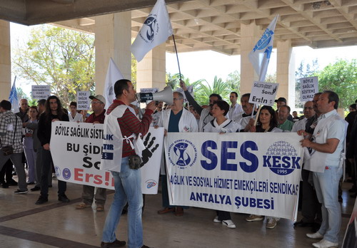(THD), Devrimci Sağlık İşçileri Sendikası ve Akdeniz Üniversitesi Öğretim Elemanları Derneği “Böyle sağlık sistemi olmaz. Sağlıkta şiddet sona Ersin” diyerek bir günlük uyarı grevi gerçekleştirdiler. Akdeniz Üniversitesi Tıp Fakültesi Hastanesi A Blok önünde toplanan sağlık emekçileri ilk olarak geçen yıl Gaziantep’te hasta yakını tarafından öldürülen Dr.Ersin Arslan anısına bir dakikalık saygı duruşu yaptı. Saygı duruşunun ardından kurumlar adına SES Antalya Şube Başkanı Mustafa Kılınç basın açıklamasını okudu.