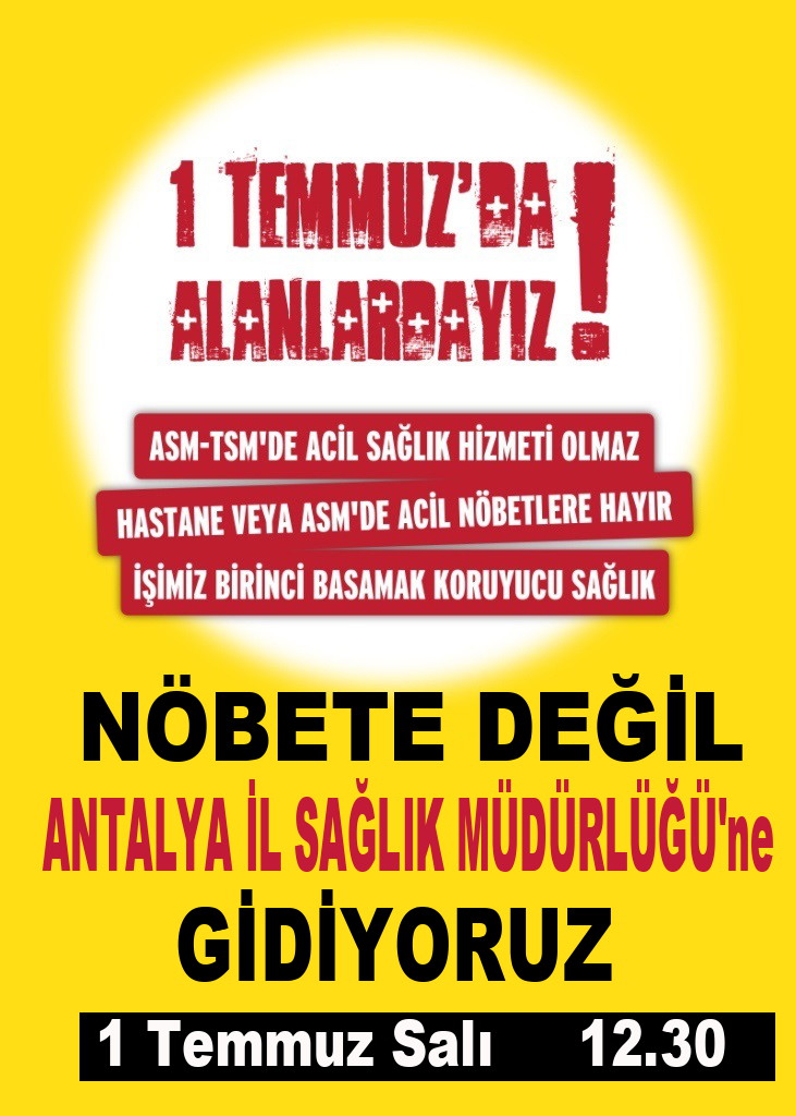 Tüm Türkiye’de eş zamanlı olarak yapılacak olan eylemi Antalya’da, Tabip Odası, Aile Hekimleri Derneği ve Türk Sağlık-Sen ile birlikte gerçekleştiriyoruz.
