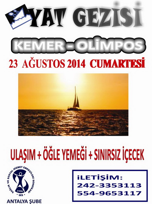 Şubemiz tarafından 23 Ağustos 2014 Cumartesi günü Kemer-Olimpos güzergahında Yat Gezisi düzenlenecektir.