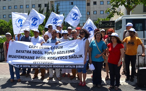 sürdüren Sağlık ve Sosyal Hizmet Emekçileri Sendikası yaptığı basın açıklamasıyla nöbet uygulamasına karşı 20-21-22 Mayıs tarihlerinde grev kararı aldıklarını ilan etti. Halk Sağlığı Müdürlüğü önünde bir açıklama yapan SES Antalya Şube Başkanı Mustafa Kılınç “ Sağlık Bakanlığı Ocak 2015’te yeni bir cümle daha kurdu: “Gece- gündüz, hafta sonu Aile Sağlığı Merkezleri açık kalacak.” dedi.