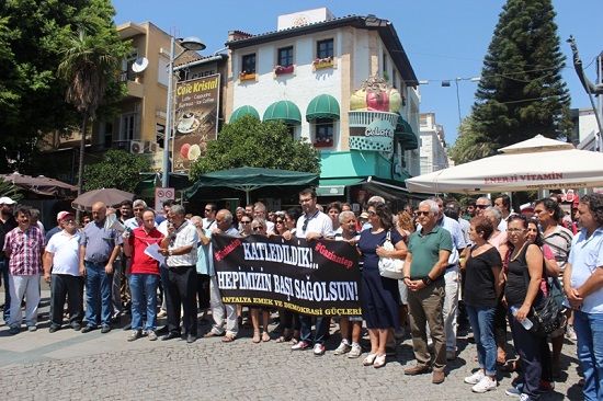 Attalos Meydanı'nda toplanan Emek ve Demokrasi Güçleri saldırıyı protesto eden sloganlar attı. Grup adına basın açıklamasını KESK Antalya Şubeler Platformu Dönem Sözcüsü Mustafa AYAR yaptı.