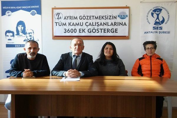 Sağlık ve Sosyal Hizmet Emekçileri Sendikası Antalya Şubesi Eş Başkanı Kenan Akkiraz tüm kamu emekçilerine ayrımsız olarak 3600 ek gösterge verilmesi talebiyle basın toplantısı. Şube binasında yapılan toplantıya yönetim kurulu üyeleri de katıldı.