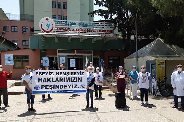 ve 12-18 Mayıs Hemşireler Haftası nedeniyle basın açıklaması yaptıAtatürk Devlet Hastanesi B Blok önünde toplanan SES üyeleri Ebeyiz Hemşireyiz Haklarımızın Peşindeyiz pankartı açtı.