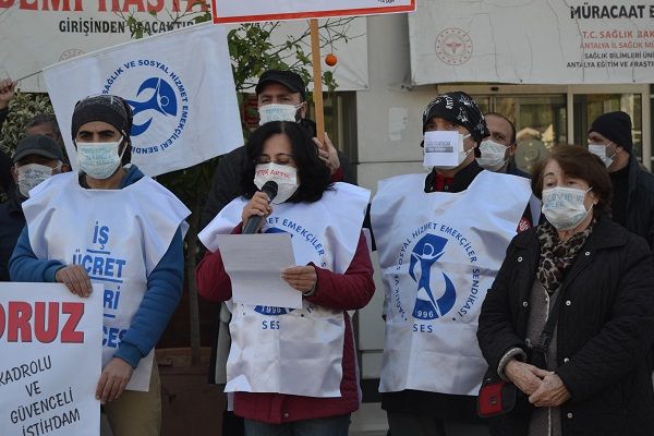 ortak eylemle sağlık emekçilerinin özlük haklarının bir an önce verilmesini talep etti. Antalya Eğitim ve Araştırma Hastanesi önünde toplanan sağlık emekçileri adına ortak açıklamayı SES Antalya Şube Eş Başkanı Şükran İçöz yaptı. Açıklamanın tam metni şu şekilde;