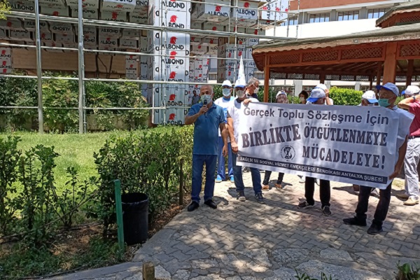 öncesi Sağlık ve Sosyal Hizmet Emekçileri Antalya Şubesi TİS taleplerini kamuoyuyla paylaştı. Akdeniz Üniversitesi Hastanesi önünde bir araya gelen SES üyeleri adına konuşan Şube Eş Başkanı Dr. Kaan Taşer “Her TİS döneminde olduğu gibi yapılan pazarlıkların “toplu satış sözleşmesi” ile sonuçlanmasını önlemek için TİS taleplerimizi hep birlikte iş yerlerimizden doğru her platformda dile getirmek zorundayız. Çünkü yandaş sendikanın taleplerimize sahip çıkma noktasındaki performansını hep birlikte izledik ve ağır sonuçlarını hep birlikte yaşadık. Çalışma hakkı ihlallerine göz yuman yandaş yetkili sendika, kölelik koşullarına geri dönüşün tüm taşlarını döşemiştir. Bu yıl yapılacak şey döşenen o taşları yerlerinden birer birer çıkarmak; birlik ve beraberlik içinde grev hakkıyla güçlendirilmiş pazarlık gücünü kullanmak için yeni bir yolda tüm farklılıkları bir kenara koyup birlikte yürümek, talepleri görünür kılmak ve taleplerimize sahip çıkmaktır” dedi.