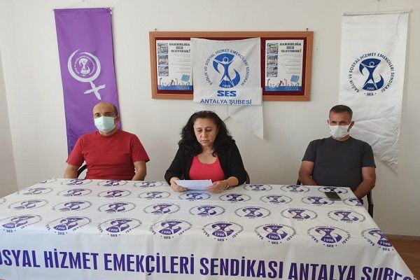 Sağlık ve Sosyal Hizmet Emekçileri Sendikası Antalya Şubesi Eş Başkanı Şükran İçöz düzenlediği basın toplantısıyla