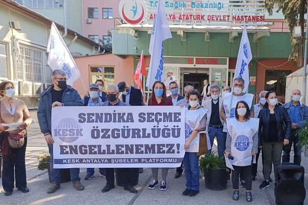 KESK Antalya Şubeler Platformu üyeleri yaptıkları basın açıklamasıyla; sendikalarına üye olmak isteyen kamu emekçilerinin tehdit edilmesini protesto etti.
