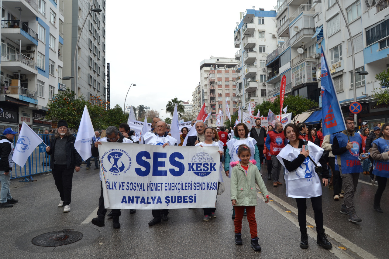 Antalya’da eylem için saat 11.30’da Aydın Kanza Parkında toplanan kamu emekçileri buradan Cumhuriyet Meydanı’na yürüdü. Yürüyüş boyunca atılan sloganlarla AKP iktidarı ve onun ekonomi politikaları protesto edildi. Eyleme yurttaşlarda evlerinin cam ve balkonlarından alkışlarla, tencere ve tava çalarak destek verdiler.