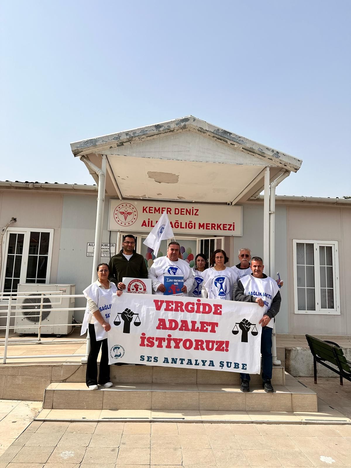 Sağlık ve Sosyal Hizmet Emekçileri Sendikası (SES) Antalya Şubesi Vergide Adalet eylemlerinin 50. Haftasında Kemer İlçesinde bulunan Deniz Aile Sağlığı Merkezi önünde basın açıklaması yaptı.