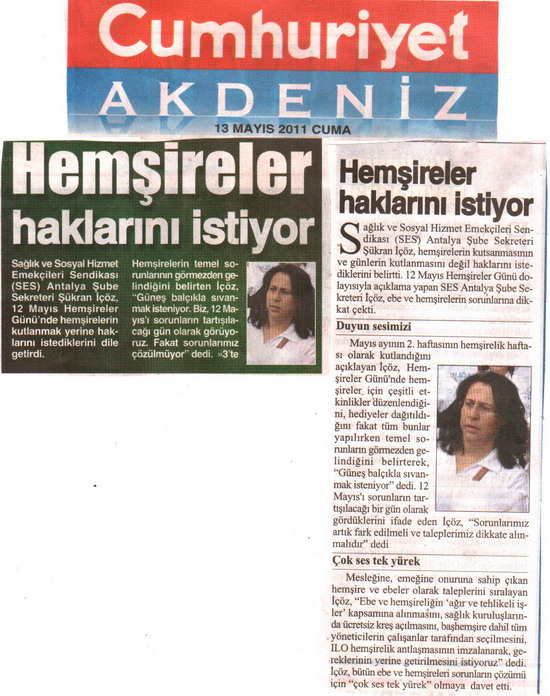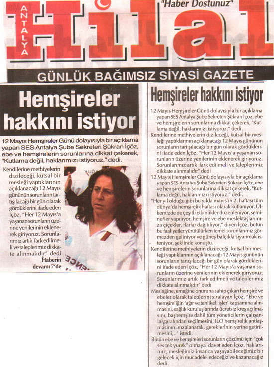 12 Mayıs Hemşireler Günü dolayısıyla SES Antalya Şube Sekreteri Şükran İçöz’ün yaptığı açıklamanın basına yansıyanlarının