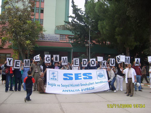 Bütçe ve Mali Kontrol Genel Müdürlüğü tarafından yayınlanan genelge ile Atatürk Devlet Hastanesi’nde de uygulamaya çalışılan ücretli yemek uygulamasını, yakalarına taktıkları “Yemeğime Dokunma” kokartı, yemek boykotu ve hastane bahçesinde yapılan basın açıklaması ile protesto etti. Antalya Atatürk Devlet Hastanesi çalışanları Sağlık ve Sosyal Hizmet Emekçileri Sendikası (SES)Antalya Şubesinin çağrısıyla öğlen yemeği yemeyen hastane çalışanları bahçeye inip, ayran simit yiyerek yapılan basın açıklamasına katıldılar.