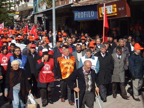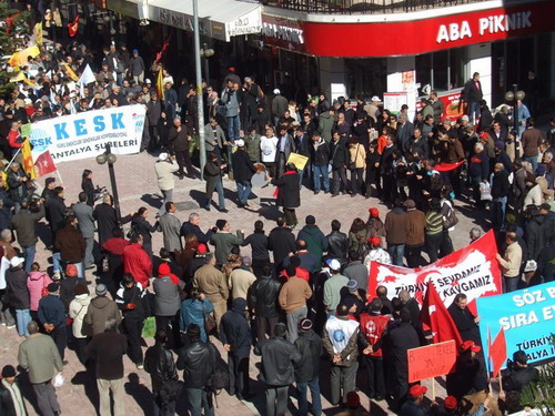 Saat 11.30'da kendilerini bekleyen Türk-İş, DİSK,Kamu-Sen ve KESK'e bağlı diğer sendikalarla kapalı yol Halk Bankası önünde buluşan eylemcilerin sayısı iki bini geçti. Eğitim-Sen, Belediye- İş, Yol İş, Genel- İş, SES, BES gibi sendikaların kitlesel olarak katıldığı eyleme Antalya'daki siyasi partiler ve dernekler de Antalya Emek ve Demokrasi Güçleri pankartının arkasında katıldılar. Buradan Kışlahan Meydanına kadar yürüyen eylemciler adına Türk-İş Bölge Başkanı Mehmet Ustali ortak basın açıklamasını okudu.Açıklamanın ardından kitle aynı coşku ve kararlılıkla dağıldı bir sonraki eyleme kadar.