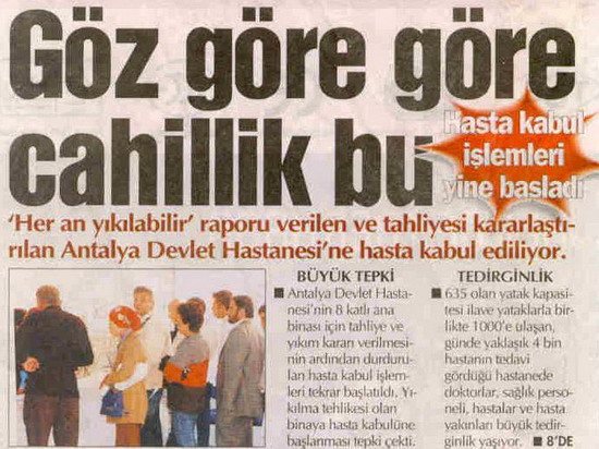 Bu haberleri uzatmak mümkün.2004 yılından bu yana yani tam yedi yıldır atıl vaziyette boş tutulan (!) ve etrafına tehlike saçtığı söylenen binanın bir an önce yıkılması ve yerine yeni bir hastane yapılacak olması elbette sevindirici bir gelişme.