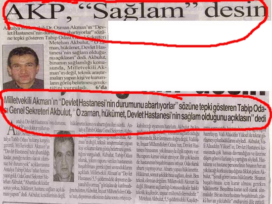 Aradan tam yedi yıl geçtikten sonra eski Antalya Devlet Hastanesi binası yıkılma tehlikesi olduğu gerekçesi ile yıkılmaya başlanmasının sevindirici bir gelişme olduğunu tekrarlayan Dr. Akbulut “ Yedi yıldır bilinen bir gerçeğe rağmen, üstelik ülkemizde benzer sorumsuzluk örneklerinden dolayı yüzlerce insanımız yaşamını yitirmişken harekete geçmeyenlerin, şimdi kendilerinin hiçbir sorumluluğu yokmuş gibi konuşmalarını kabullenmek mümkün değil. Bu süre içerisinde şans eseri bir felaket yaşanmaması bu kişi ve kurumların sorumluluklarını azaltmaz. O dönem AKP’nin başhekim koltuğuna oturttuğu Dr. Arif Bulut şimdi CHP Antalya Milletvekili. O günlerde bizleri suçlayan ve hedef gösteren ”İddialar yalan, tedbir alıyoruz” diyen Dr.Arif Bulut, sessizliğini sürdürüyor.Antalya Tabip Odası’nda AKP ile dirsek teması ve gönül bağı olan bir yönetim kurulu var. Oda yönetimindeki “Hekim Birliği Grubu” da her zaman ki gibi susuyor, görmüyor, duymuyor.” dedi.