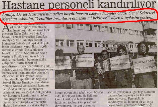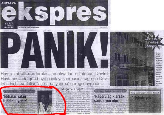 Anımsamakta yarar var; 29.12.2004 tarihinde Antalya Devlet Hastanesi’nde olağandışı gelişmeler yaşandı. Hiç bir açıklama yapılmadan, hastanede ameliyat yapılmayacağı, yeni hasta ve ziyaretçi kabul edilmeyeceği, taburcu olabilecek hastaların hemen gönderilmesi şeklindeki bir karar hastane çalışanlarına başhekim Dr. Arif Bulut’un talimatıyla duyuruldu.