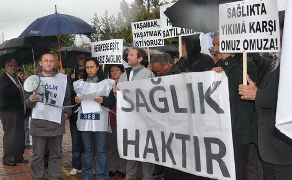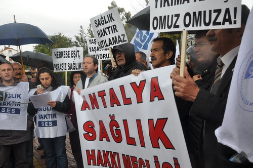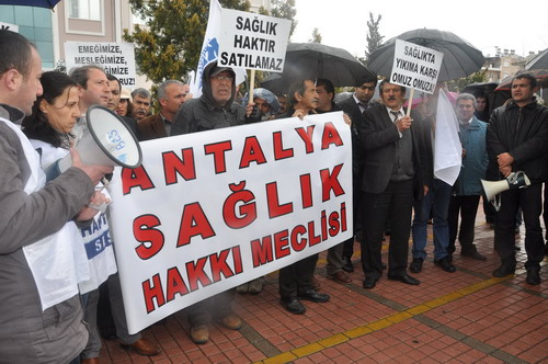 Etkili yağan yağmura rağmen İl Sağlık Müdürlüğü önünde toplanan Antalya Sağlık Hakkı Meclisi üyeleri, sık sık “Sağlık Haktır Satılamaz” “Yaşasın onurlu mücadelemiz” “AKP Sağlığa Zararlıdır” sloganları attılar.