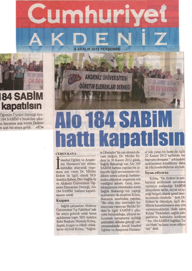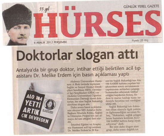 Dr.Melike Erdem’in intiharı ile ilgili SES Antalya Şubesi, Dev-Sağlık-İş ve Akdeniz Üniversitesi