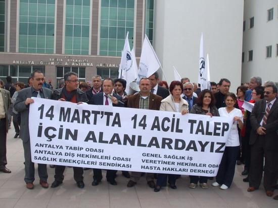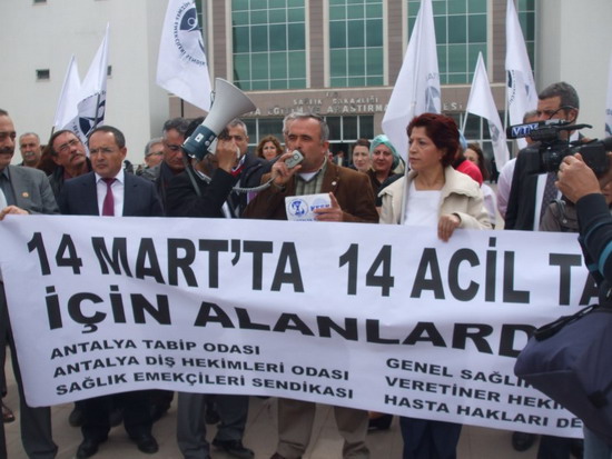 SES Antalya Şube Başkanı Mustafa Kılınç, on yıldır AKP’nin Sağlıkta Dönüşüm adı altında uyguladığı politikanın hastaları ve sağlık emekçilerini mağdur ettiğini ifade etti. Mustafa Kılınç “ Hepimizin mesleği değersizleşti, görev tanımlarımız ve sınırları değişti, her işi yapar olduk.On yılda, onlarca arkadaşımızı kurban verdik: Ya şiddete, ya iş kazasına ya da meslek hastalığına. Saldırı ve şiddet sonucu yaralananların sayısını bilmiyoruz, unuttuk. On yılda poliklinik sayısı üç kat, ameliyat sayısı dört kat arttı, artan bu yükün altından kalkmaya, halka nitelikli bir hizmet vermeye çalıştık.