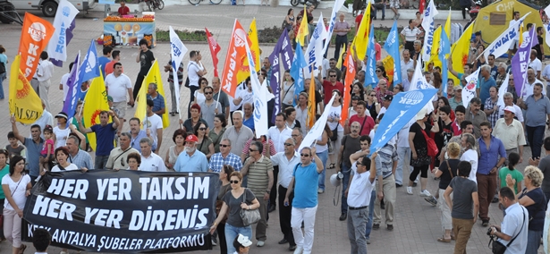 “Her Yer Taksim Her Yer Direniş” şiarı ile bir yürüyüş gerçekleştirdi. Yavuz Özcan Parkında toplanan yüzlerce KESK üyesi “AKP’den Hesap Soracağız” “Hükümet İsitifa” “Faşizme Karşı Omuz Omuza” “Kurtuluş Yok Tek Başına Ya Hep Beraber Ya Hiç Birimiz” sloganları ile Cumhuriyet Meydanına kadar yürüdü. Yol boyunca yurttaşların alkışlarla ve sloganlara destek verdiği yürüyüş sonunda, Cumhuriyet Meydanında KESK Antalya Şubeler Platformu Dönem Sözcüsü Nuretttin Sönmez bir açıklama yaptı. Açıklmanın ardından halaylar çekildi.