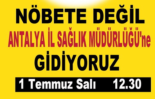 Sağlık Bakanlığının dayatmacı tutumuna karşı, mesleki ve iş alanımıza sahip çıkmak, haklarımızı korumak, sorunlarımızı kamuoyu ile paylaşmak için 1 Temmuz 2014 Salı günü 12.30’da Antalya Sağlık Müdürlüğü önünde olacağız.