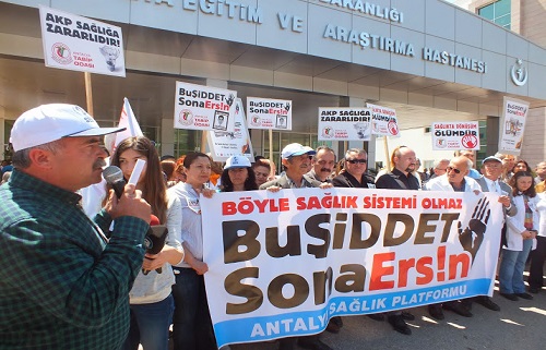 Antalya Tabip Odası, Antalya Diş Hekimleri Odası, Antalya Veteriner Hekimler Odası, SES Antalya Şubesi, Türk Hemşireler Derneği Antalya Şubesi, Türk Ebeler Derneği Antalya Şubesi ve Sosyal Hizmet Uzmanları Derneği Antalya Şubesi’nin kurucusu olduğu Antalya Sağlık Platformu ilk olarak ‘Bu şiddet sona ersin’ konulu basın açıklaması yaptı. Sağlık çalışanları ellerinde “Sağlıkta dönüşüm ölümdür”, “AKP sağlığa zararlıdır”,”Bu şiddet sona-Ersin” yazılı pankartlar taşıyarak, sloganlar attılar