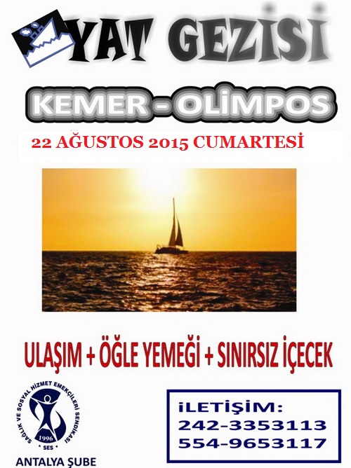 Şubemiz tarafından 22 Ağustos 2015 Cumartesi günü Kemer-Olimpos güzergahında Yat Gezisi düzenlenecektir.