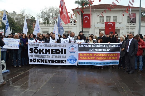 edildi. Menderes Türel Antalya Büyükşehir Belediyesi’nde çalışan ve AKP’li ya da onlara yakın olmayan kamu emekçilerini ilçelere sürgün etmeye başladı. Tabii bu sürgünden ilk nasibini alan da KESK’li kamu emekçileri oldu.