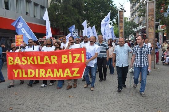 Vazgeçmeyeceğiz mitinginin yasaklanması KESK Antalya Şubeler Platformu tarafından protesto edildi. Kapalı Yol Halk Bankası önünde toplanan KESK üyeleri kararı protesto için ağızlarını siyah bantla kapattı.