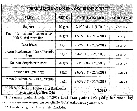 - Bu fıkranın yürürlüğe girdiği tarihten itibaren (02.01.2018) on gün içinde idaresinin hizmet alım sözleşmesinin yapıldığı birimine, sürekli işçi kadrolarında istihdam edilmek üzere yazılı olarak başvuracak