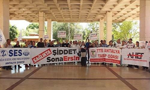 A.Ü.T.F. Hastanesi A Blok önünde toplananlar sık sık "Sağlıkta Şiddet Sona Ersin, Sağlıkta Şiddeti Önleme Yasası Çıkartılsın, Sağlıkta Dönüşüm Ölüm Demektir, AKP Sağlığa Zararlıdır" sloganları attılar. Tüm ülke genelinde yapılan basın açıklamasını Antalya Tabip Odası Başkanı Prof.Dr. Nursel Şahin okudu.