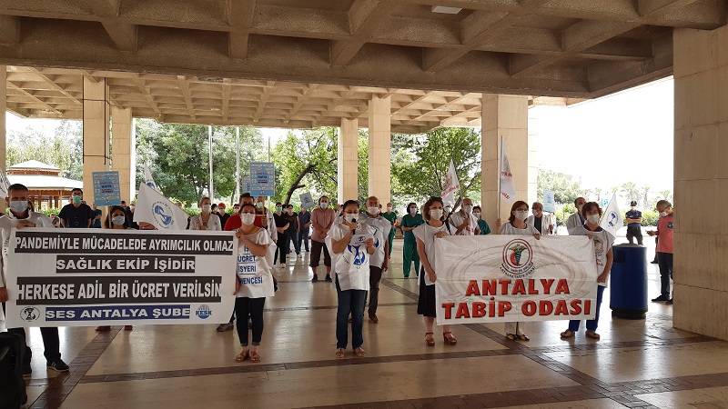 Salgın sürecinde Sağlık Bakanlığı’nın güya sağlık emekçilerini ödüllendirmek iddiası ile ortaya attığı "üç ay süreyle tavandan ödeme" uygulaması mevcut adaletsizliği daha da derinleştirmiş, salgın döneminde yeni sorunlar ekleyerek devam ettirmiştir. Salgındaki emeğimizi, aldığımız riski performans terazisi ile ölçmeye kalkanlar, alanda canla başla her türlü risk altında çalışan sağlık emekçilerini bir kez daha yıkıma uğratmıştır.