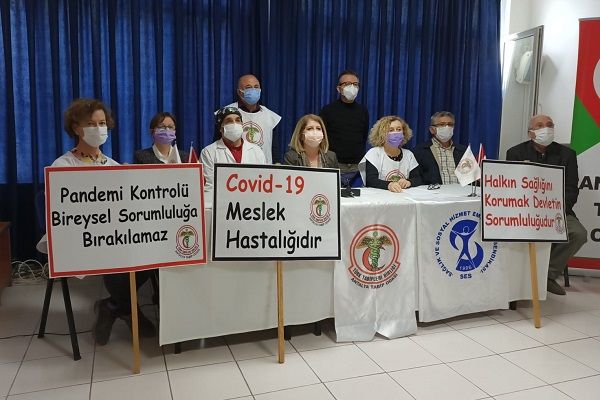 Pandemi sürecinde sağlık çalışanlarının özverili çalışmalarına karşılık salgının başlangıcından itibaren Sağlık Bakanlığı tarafından yeterince korunamama, salgını yönetmedeki başarısızlıklar sonucunda 150 binden fazla sağlık çalışanı hastalanmış ve 385’si vefat etmiştir. Ağır çalışma koşulları hekim ve sağlık çalışanlarında tükenmişlik yaratmıştır. İnsan hakları ve Uluslararası Çalışma Haklarına aykırı olarak emeklilik, izin ve istifa hakları ellerinden alınan sağlık çalışanlarının özlük hakları ve çalışma koşulları pandemi süresince kötüleşmiştir.
