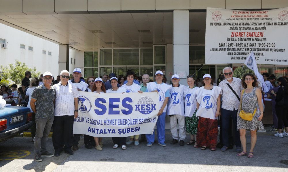 Sağlık ve Sosyal Hizmet Birlik Platformunun çağrısıyla Antalya Eğitim ve Araştırma Hastanesinde bir araya gelen sağlık emekçiler basın açıklaması yaptı. Açıklama da konuşan SES Antalya Şube Eş Başkanı Şükran İçöz şunları ifade etti.