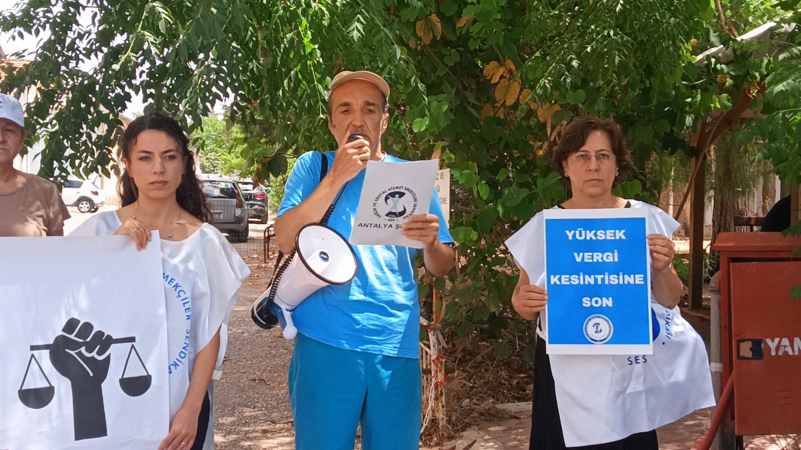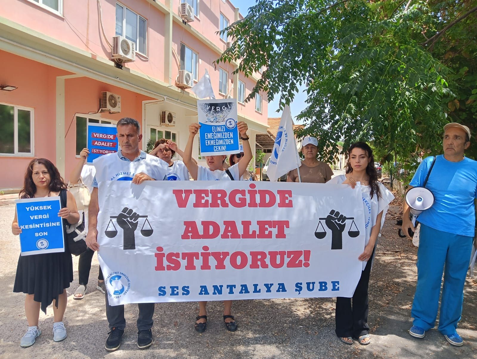 Sağlık ve Sosyal Hizmet Emekçileri Sendikası (SES) Antalya Şubesi Vergide Adalet eylemlerini sürdürüyor. Muratpaşa İlçe Sağlık Müdürlüğü önünde toplanan SES Antalya Şube üyeleri adına basın açıklamasını Şube Eş Başkanı Dr. Kaan Taşer yaptı.
