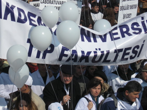 Mitinge katılmak üzere Türkiye'nin çeşitli yerlerinden gelen sağlık çalışanları, sabah saatlerinden itibaren Ankara Garı'nda toplanmaya başladı. "Sağlıkta özelleştirmeye karşı çok ses tek yürek", "Kadrolu iş, güvenli gelecek", "Sağlık haktır, satılamaz", "Taşerona başkaldırıyoruz", "Sağlıkta ticaret ölüm demektir", "Sağlık haktır" ve "Sağlıkta dönüşüm yalanına hayır" yazılı pankartlar ve dövizler taşıyan topluluk, "AKP sağlığa zararlıdır", "Sağlık haktır satılamaz", "Gün gelecek, devran dönecek, AKP hakla hesap verecek" sloganları, şarkılar ve türküler eşliğinde Sıhhiye'ye doğru yürüyüşe geçti.